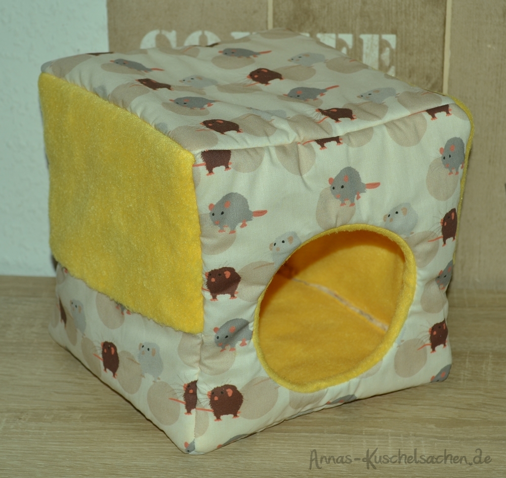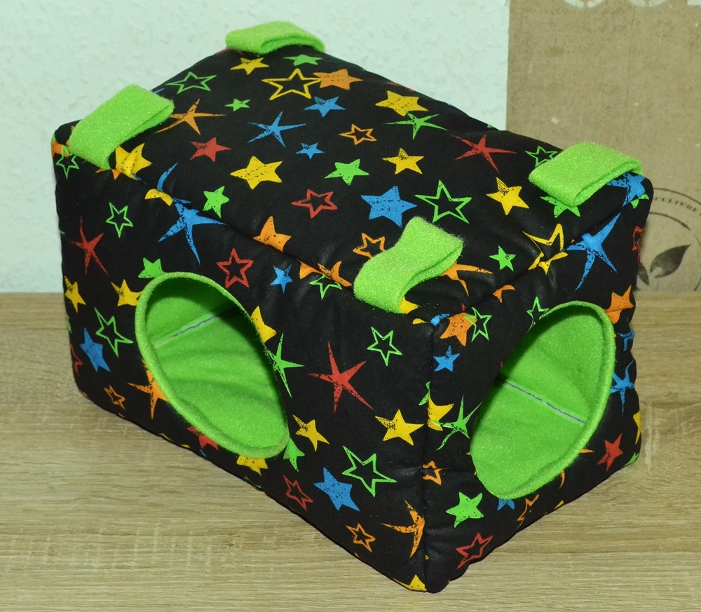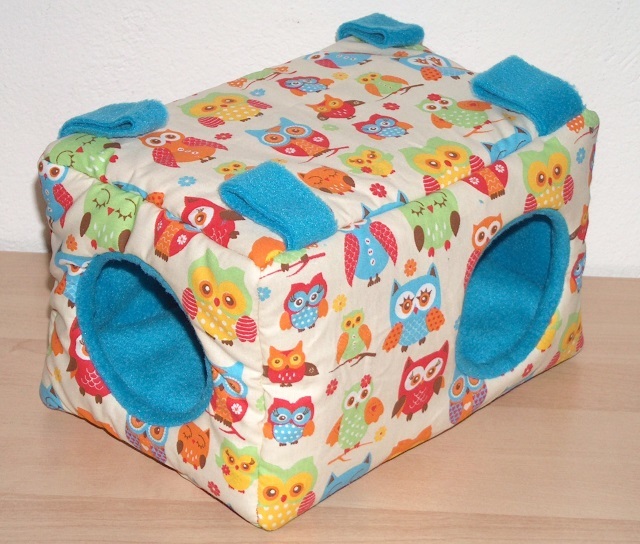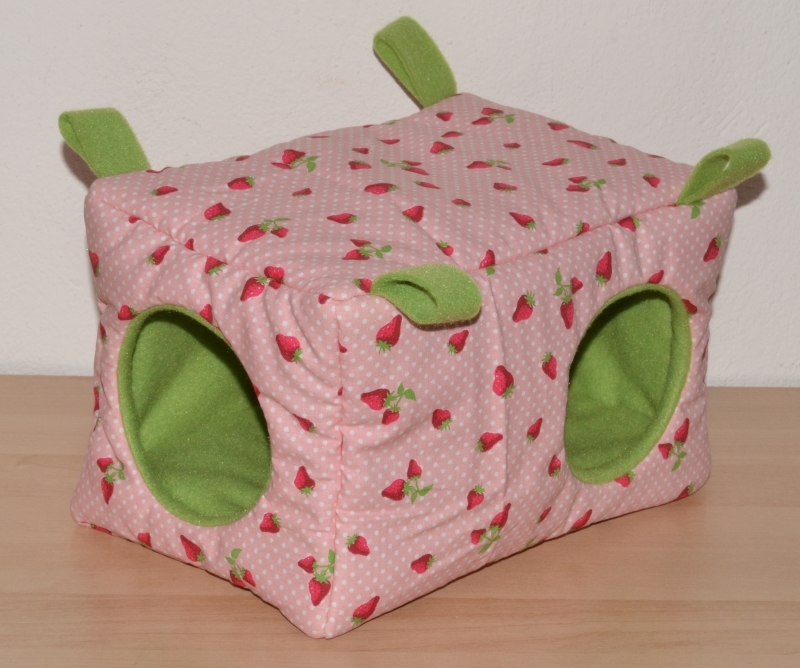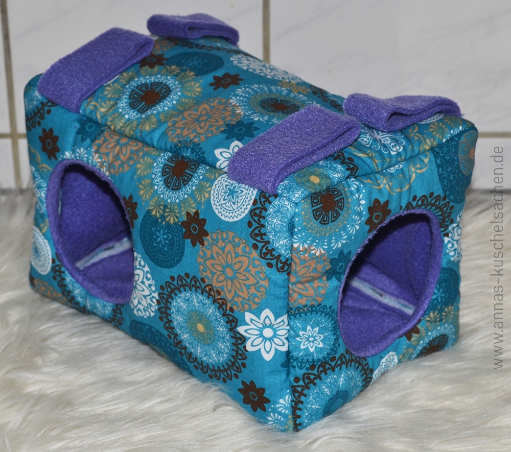 Dieses Kuschelhaus hat eine längliche Form und eine Grundfläche von 25 x 17 cm, sowie eine Höhe von 17 cm. Dieses Kuschelhaus hat standardmäßig vorne und seitlich je einen Eingang, sowie vier Schlaufen, um es aufzuhängen. Zwischen dem Innen- und Außenstoff ist es mit Volumenvlies verstärkt, kann aber auch ohne angefertigt werden. Es ist auf 30°C in der Waschmaschine waschbar.