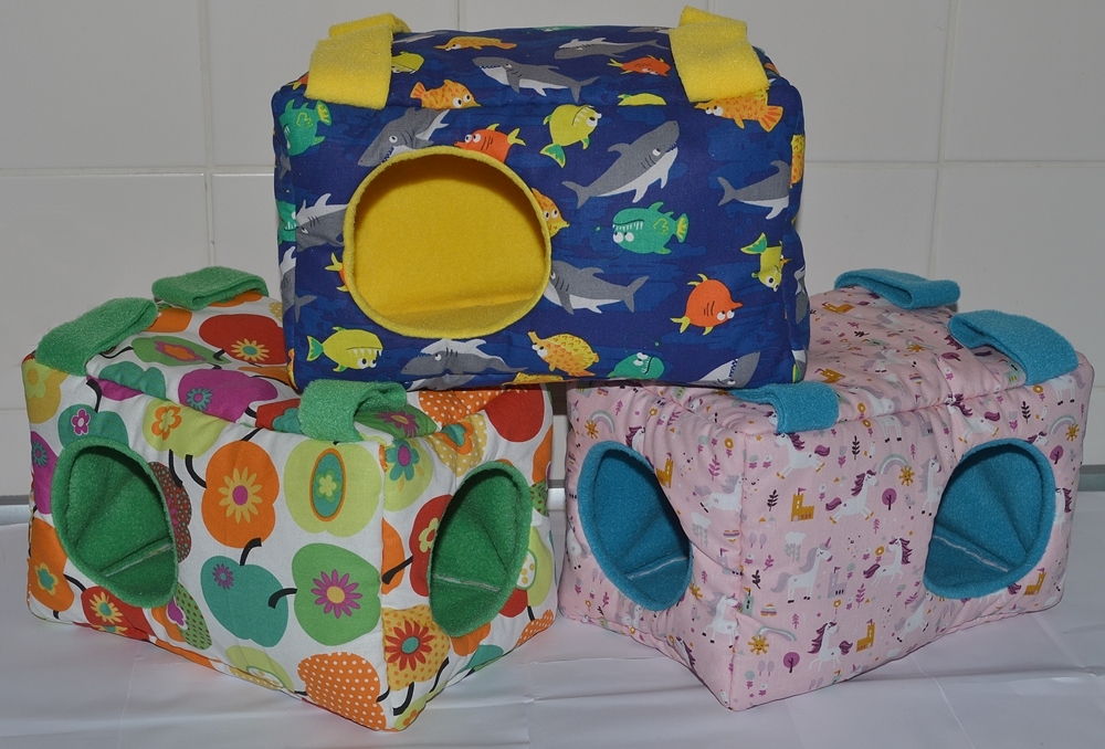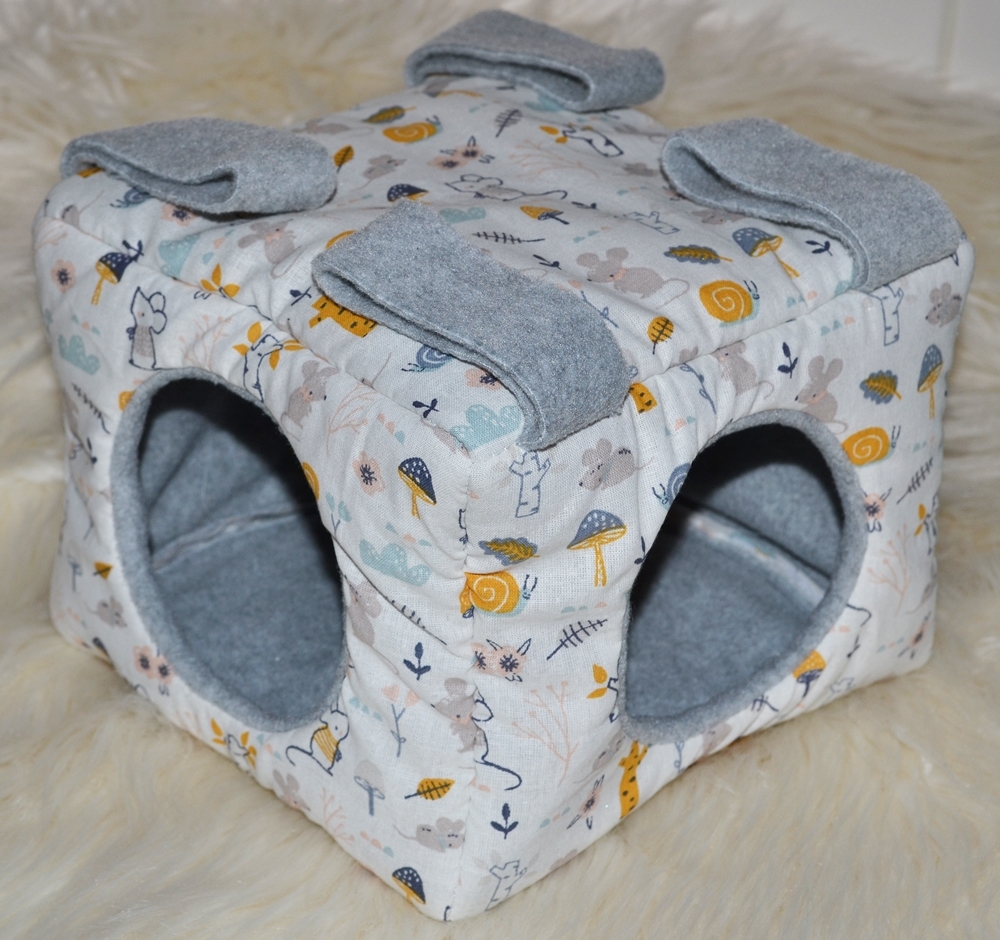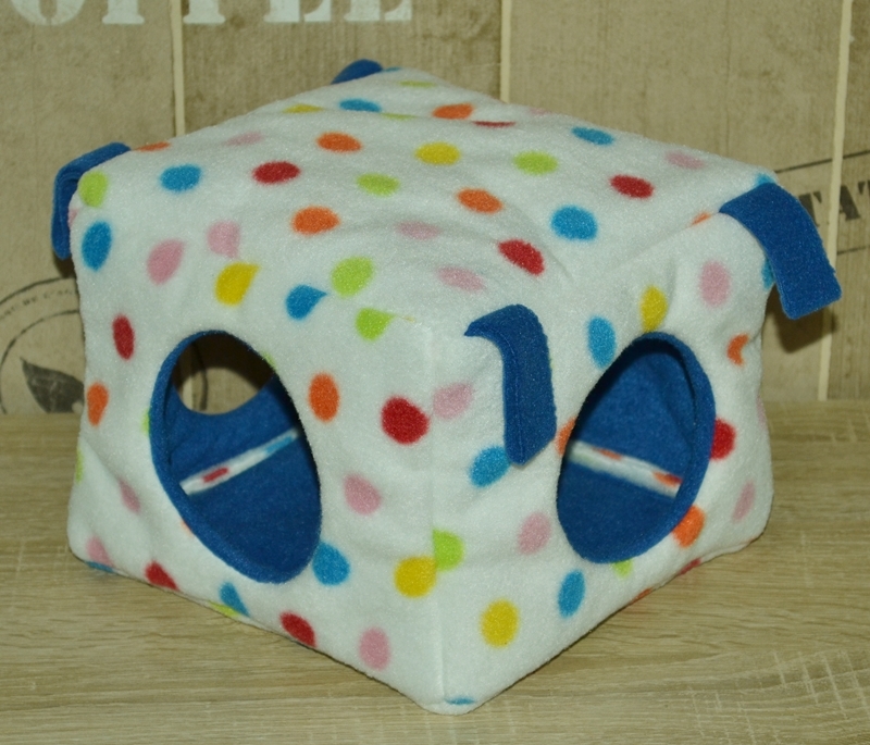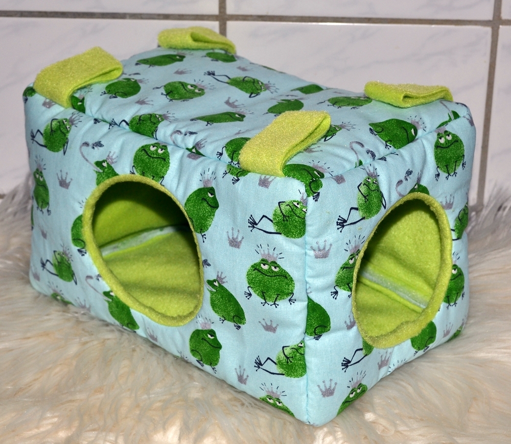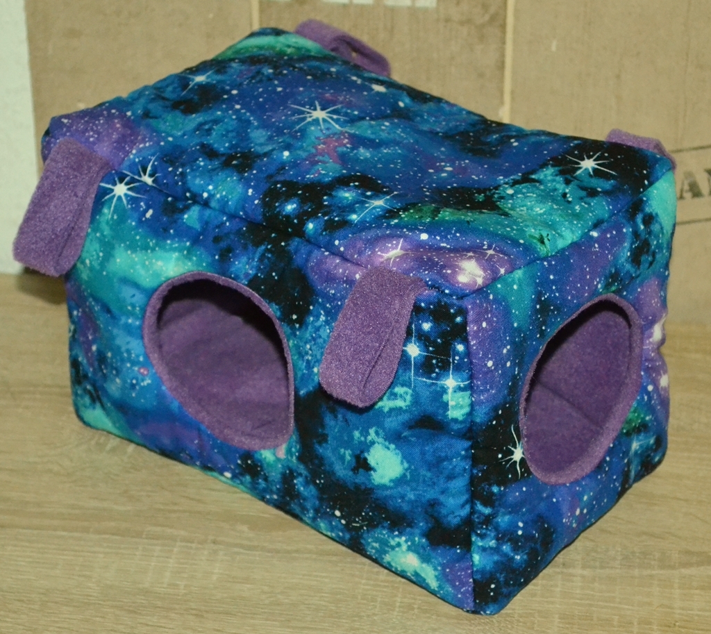 Dieses Kuschelhaus hat eine längliche Form und eine Grundfläche von 25 x 17 cm, sowie eine Höhe von 17 cm. Dieses Kuschelhaus hat standardmäßig vorne und seitlich je einen Eingang, sowie vier Schlaufen, um es aufzuhängen. Zwischen dem Innen- und Außenstoff ist es mit Volumenvlies verstärkt, kann aber auch ohne angefertigt werden. Es ist auf 30°C in der Waschmaschine waschbar.