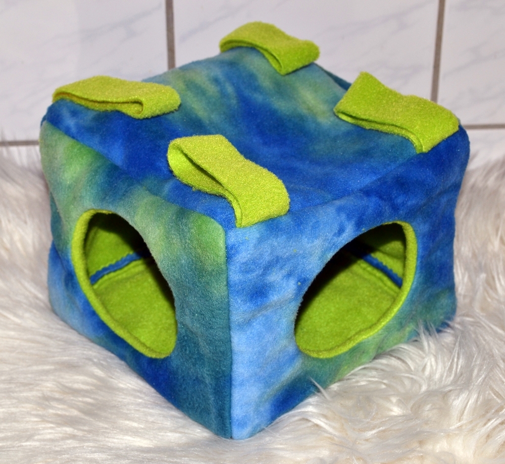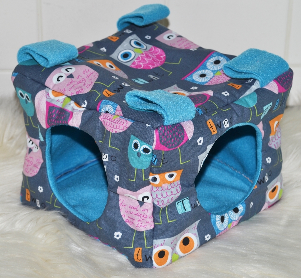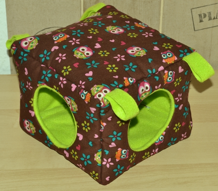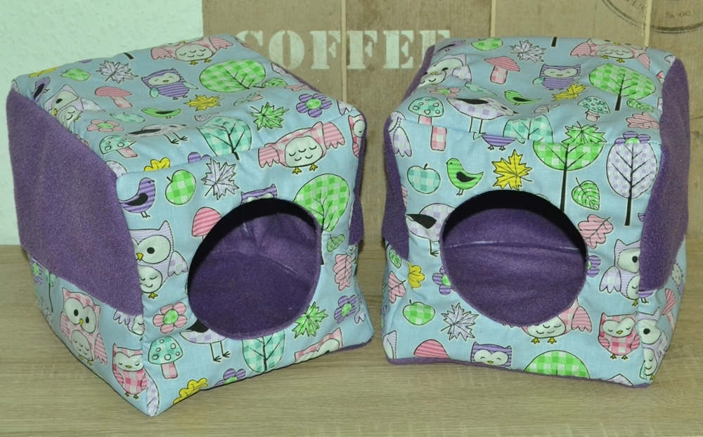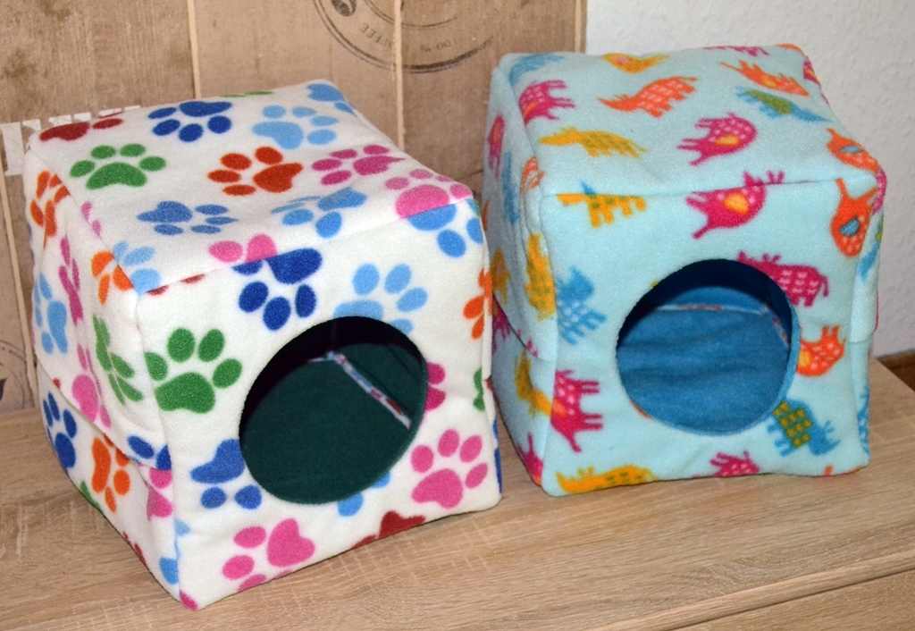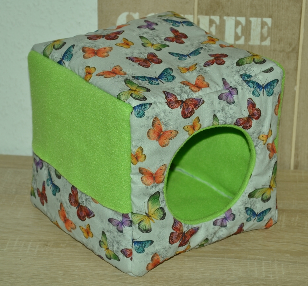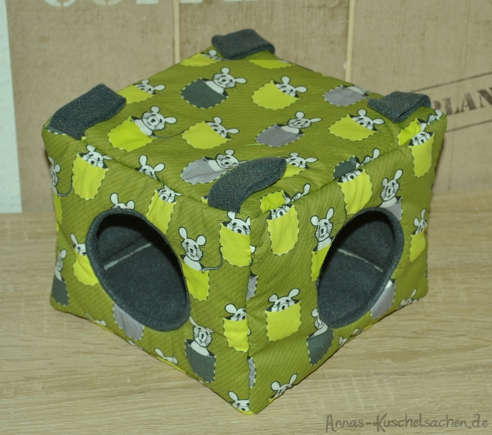Quaderförmig heißt in diesem Fall eine Grundfläche von 20 x 20 cm und eine Höhe von 15 cm. Dieses Kuschelhaus hat vorne und seitlich je einen Eingang, sowie vier Schlaufen, um es aufzuhängen. Zwischen dem Innen- und Außenstoff ist es standardmäßig mit Volumenvlies verstärkt, kann aber auch ohne angefertigt werden. Es ist auf 30°C in der Waschmaschine waschbar.