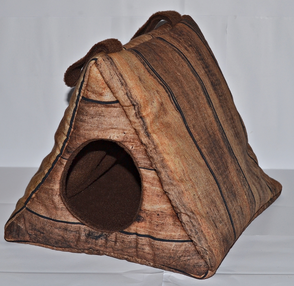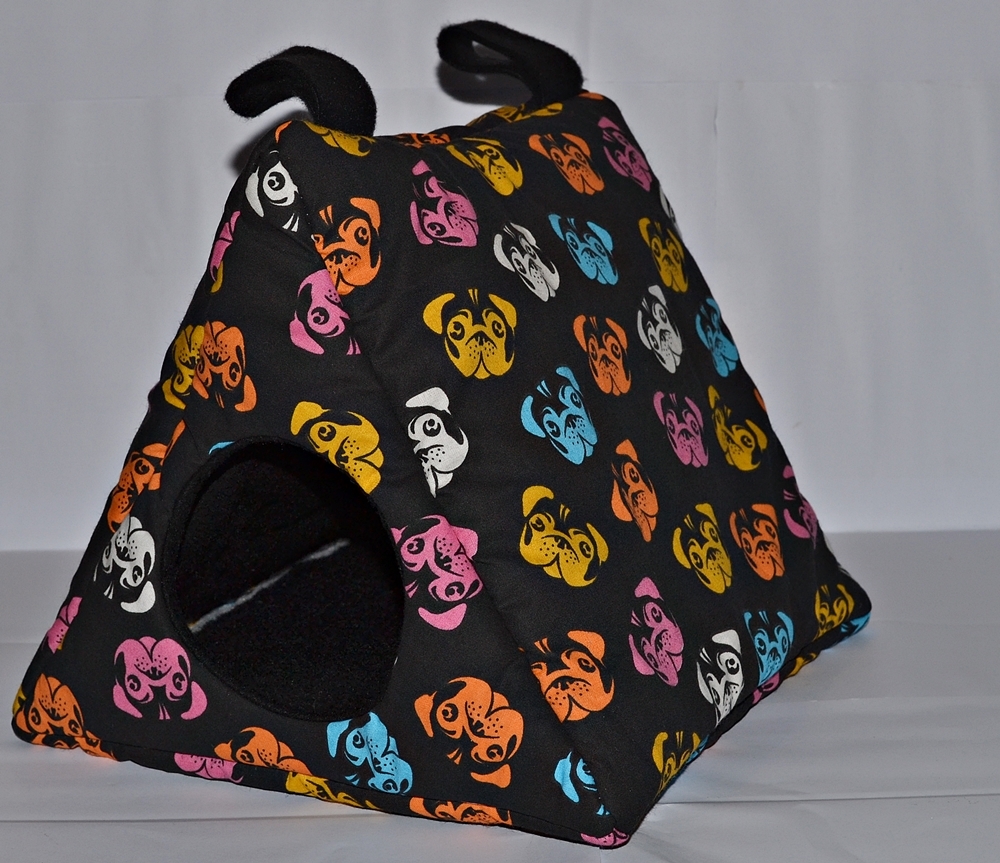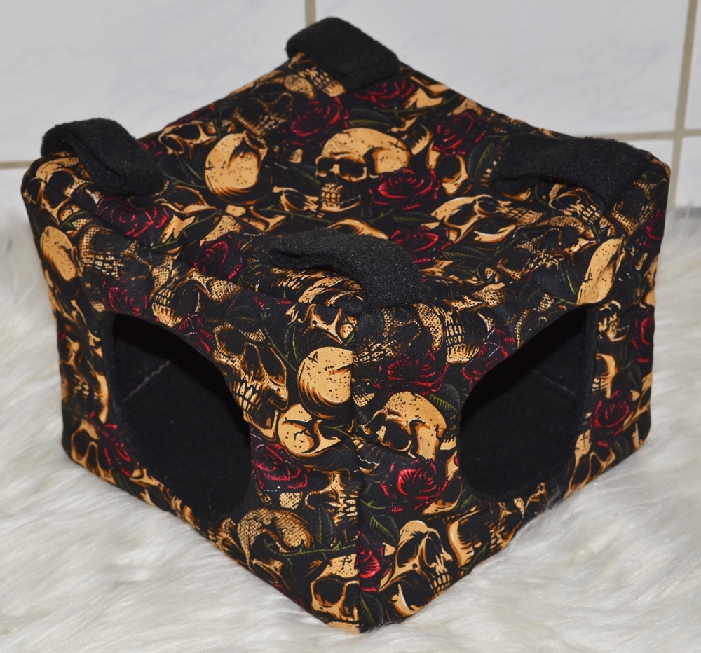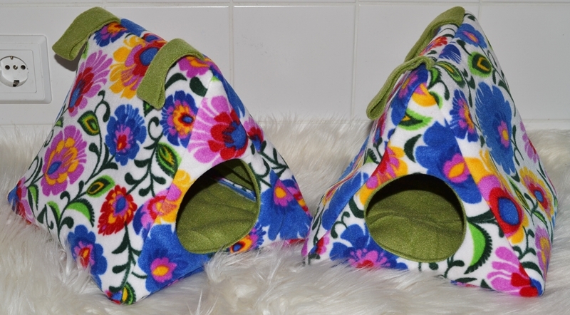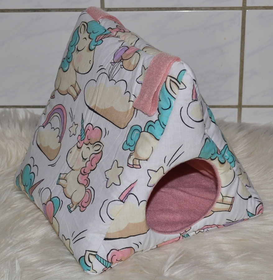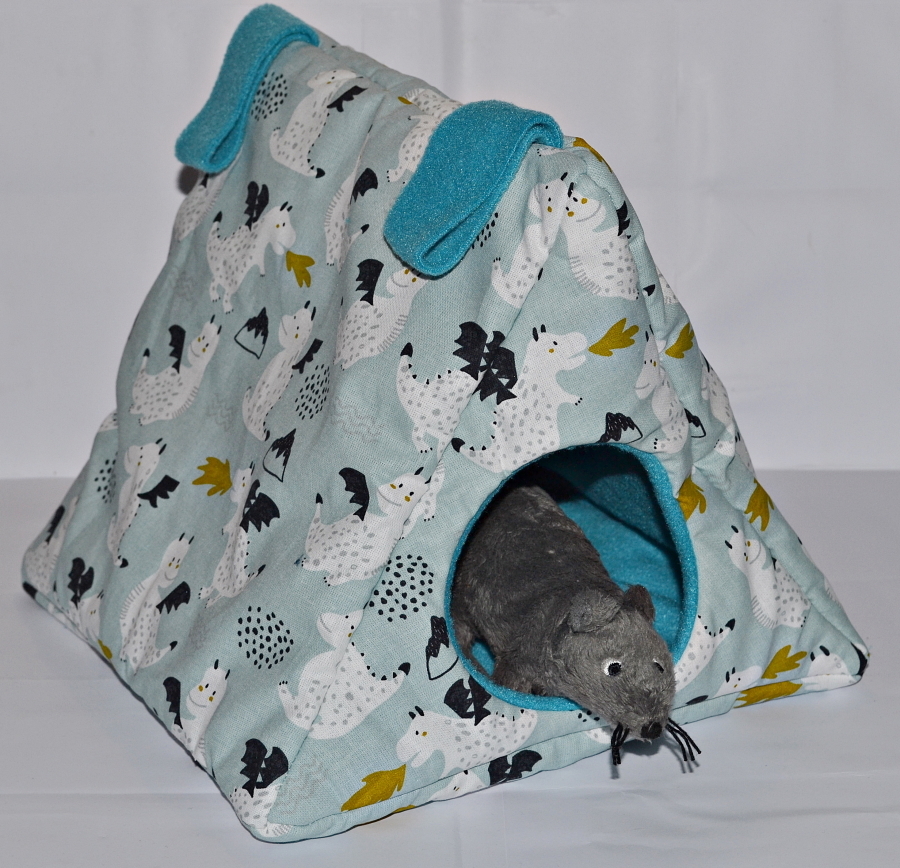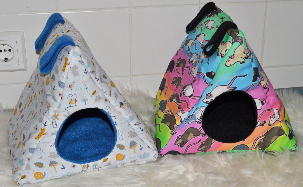 Dieser zeltförmige Unterschlupf bietet mit einer Grundfläche von ca. 25 x 25 cm viel Platz für mehrere Tiere. Die Höhe beträgt ca. 22 cm. Zwischen dem Innen- und Außenstoff ist es mit Volumenvlies verstärkt, kann aber auch ohne angefertigt werden. Es ist auf 30°C in der Waschmaschine waschbar. Oben können Schlaufen angebracht werden, um das Kuschelzelt am Käfig zu befestigen. Aufgrund seiner "Bauweise" fällt es aber nicht zusammen und kann auch ohne Befestigung aufrecht stehen. Durch den Eingang von Ø ca. 9 cm hat das Kuschelzelt die ideale Größe für Ratten oder Degus.
