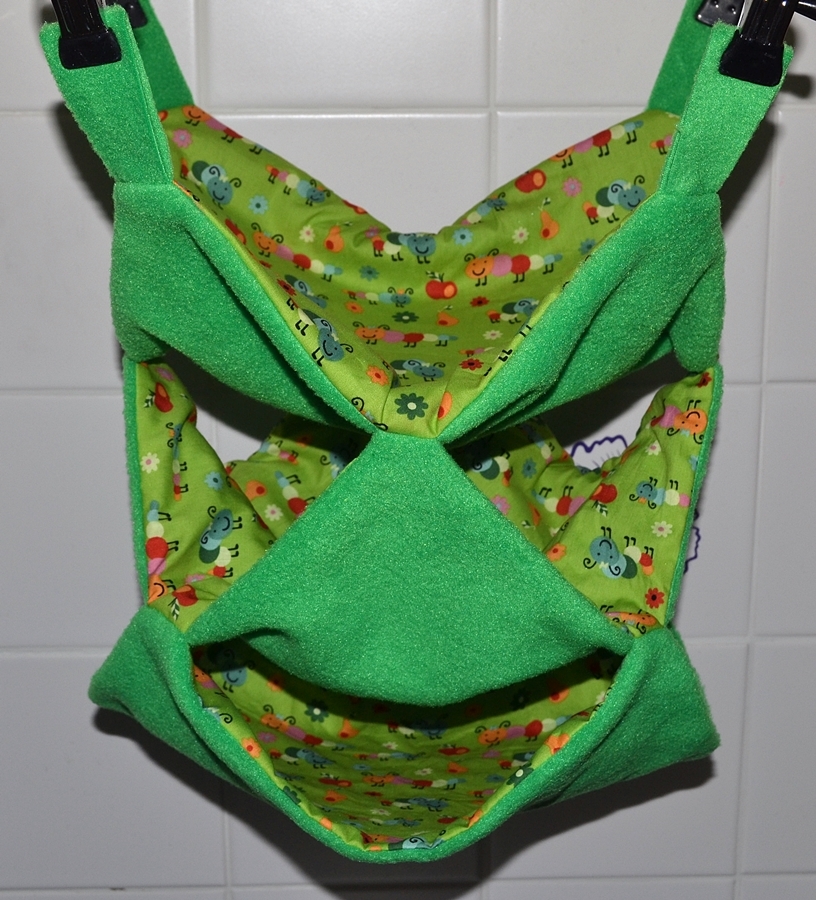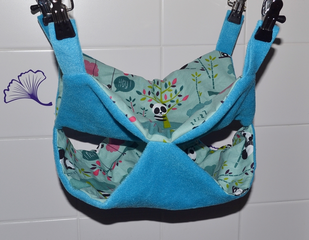 Diese Hängematte ist 44 cm lang und 30 cm breit und verfügt über vier Schlaufen, damit man sie aufhängen kann. Wie alle anderen Sachen auch, ist sie auf 30°C in der Waschmaschine waschbar.