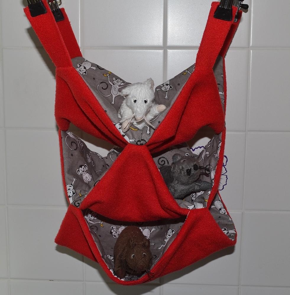 Die Multifunktionshängematte hat in der Mitte eine weitere doppelte Stofflage angebracht und kann von zwei Seiten verwendet werden. Liegt dieses "Dach" oben, können die Tiere sich in der Hängematte liegend darunter verstecken. Dreht man sie jedoch um, ergibt sich eine Art Doppelhängematte, so dass die Tiere auf zwei Ebenen liegen können (siehe Bilder unten).