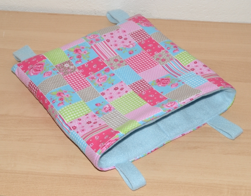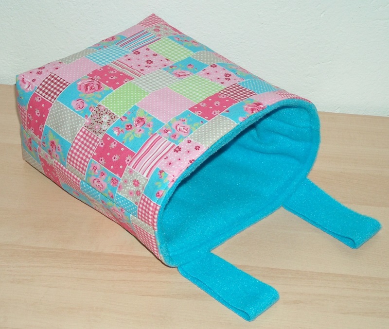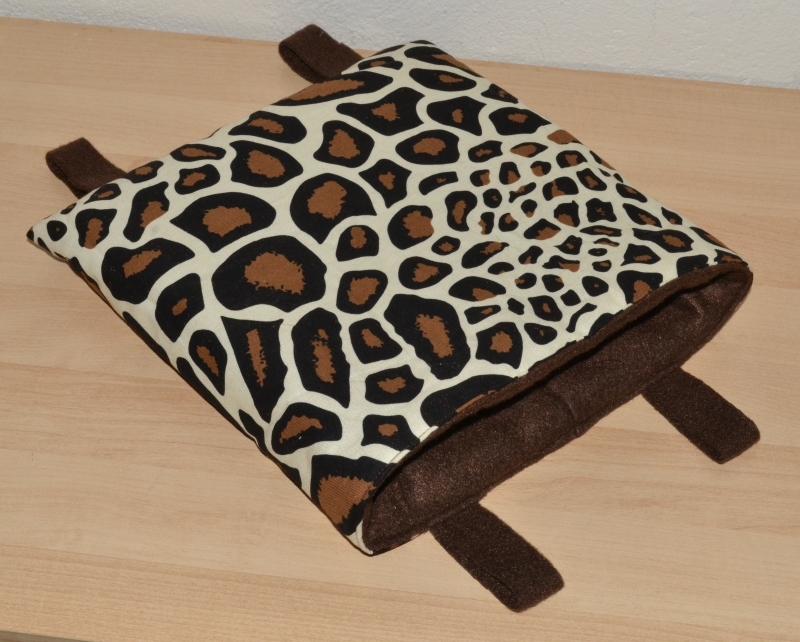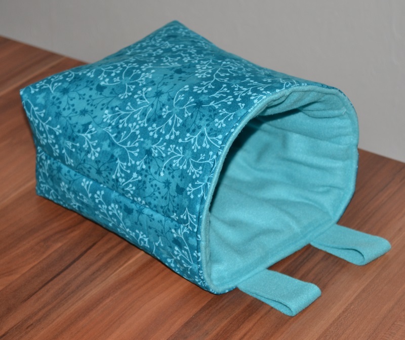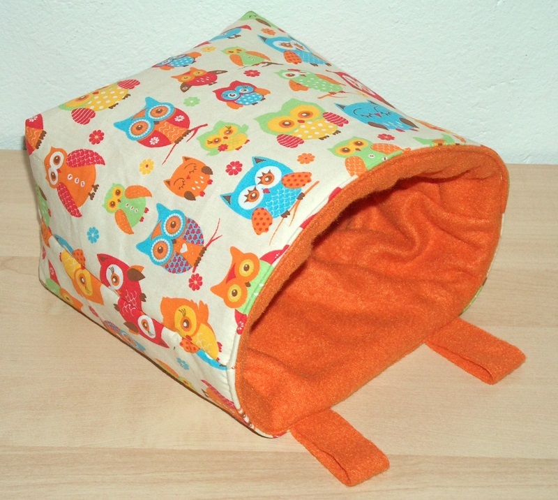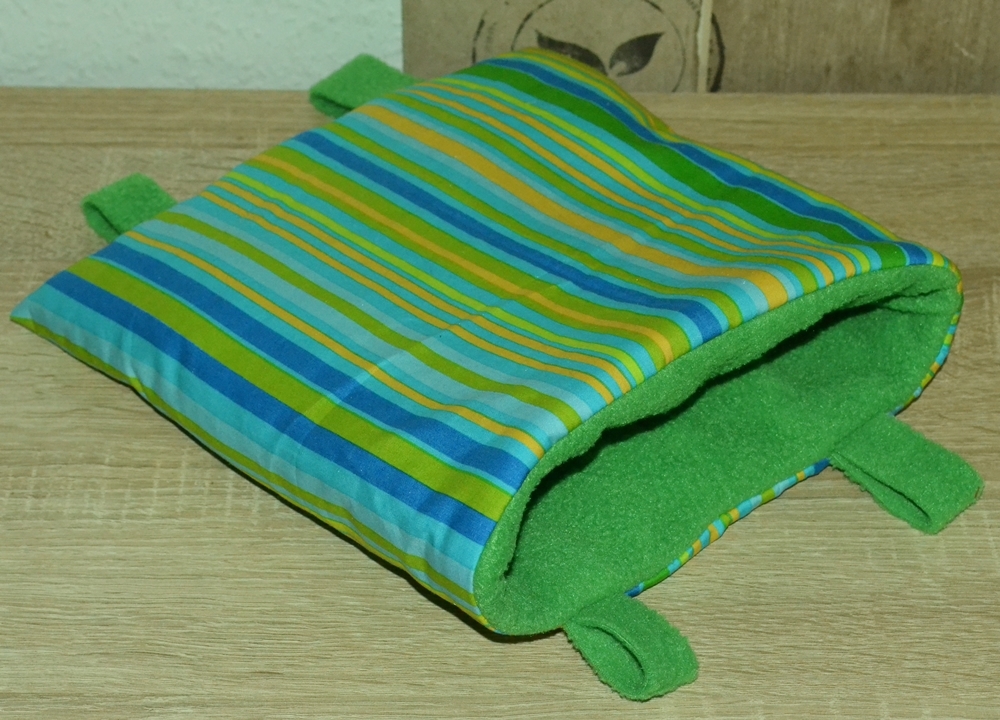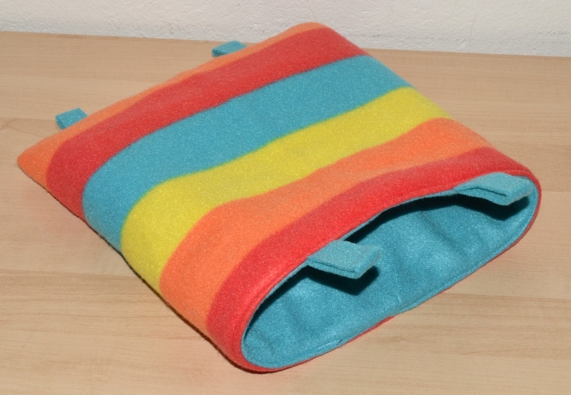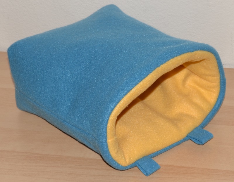 Dieser Kuschelsack hat eine Art "Standboden", so dass er offen steht und die Tiere sich hineinkuscheln können. Er ist 20 x 17 cm groß und enthält oben zwei Schlaufen. So kann er z.B. am Gitter befestigt werden, damit die Tiere ihn nicht wegschleppen. Auch als Unterschlupfmöglichkeit in der Transportbox eignet sich dieser Kuschelsack sehr gut.