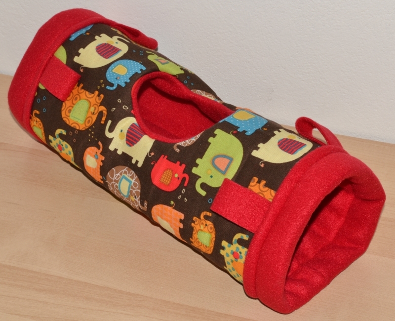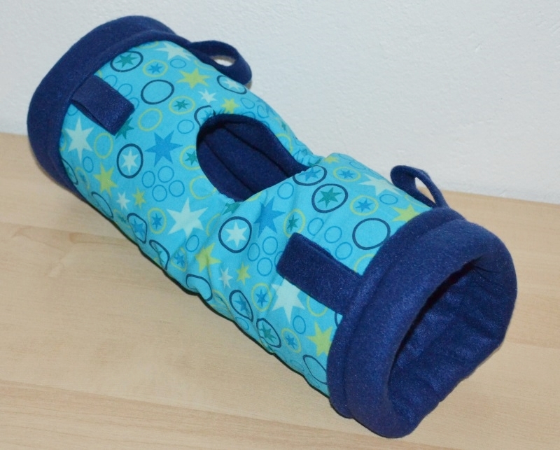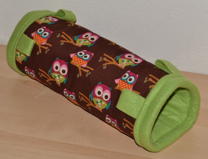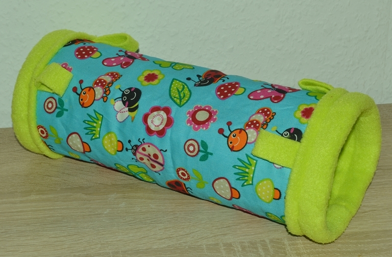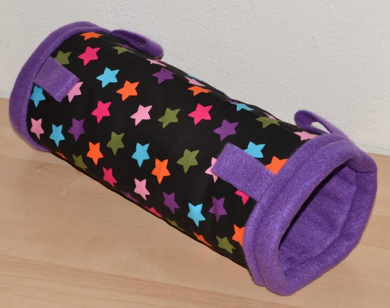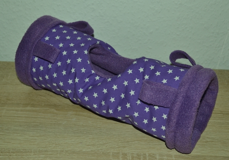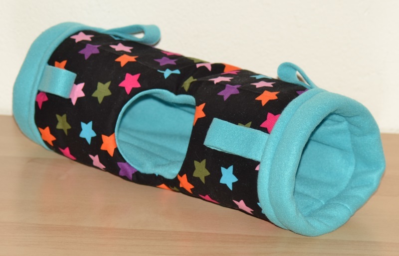 Meine Kuscheltunnel sind 35 cm lang und standardmäßig 12 cm im Durchmesser. Sie sind damit optimal für Farbratten geeignet. Der Tunnel hat an beiden Enden je zwei Schlaufen, um ihn aufzuhängen.